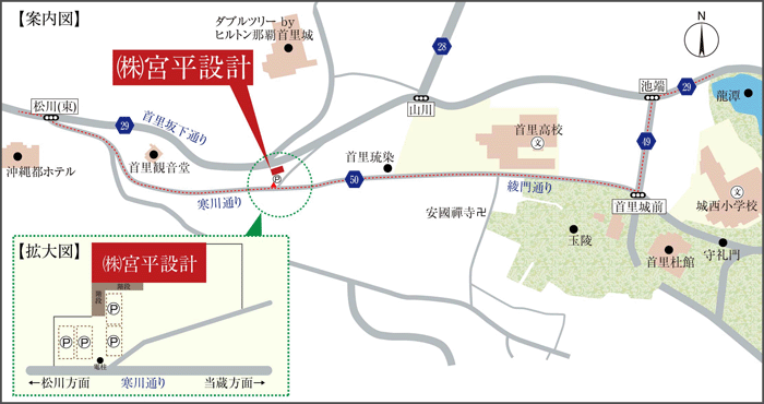 「松川(東)」信号を右折、首里観音堂向け寒川通りから約200m左側にあります。